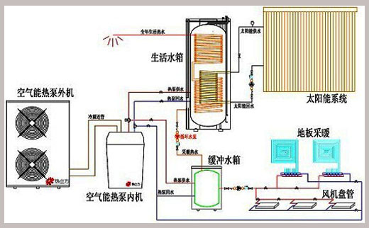 系統(tǒng)采用空氣能熱泵輔助太陽能,或電輔助太陽能,或單獨(dú)空氣能熱泵帶動(dòng),結(jié)合地暖、風(fēng)機(jī)盤管(立式或者吊頂)實(shí)現(xiàn)冬季采暖;