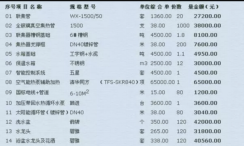 其中包括:聯(lián)集管(27200.00)、全玻璃真空集熱管(38000.00)、聯(lián)集器槽鋼基礎(chǔ)(8100.00)、集熱器支撐框(7600.00)、加壓帶回水熱循環(huán)水泵(3600.00)。