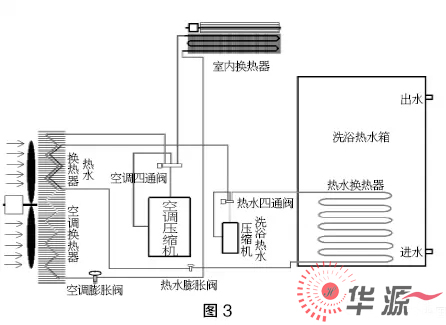 熱泵三聯(lián)供系統(tǒng),概念新穎,所謂空調(diào)模式運(yùn)行時可以免費(fèi)加熱洗浴熱水,購買一套三聯(lián)供設(shè)備,可以實(shí)現(xiàn)室內(nèi)制冷、供暖及洗浴熱水??梢越档筒糠殖跬顿Y,但運(yùn)行費(fèi)用與空調(diào)加空氣源熱泵熱水機(jī)的運(yùn)行費(fèi)用是相同的。如下圖2所示: